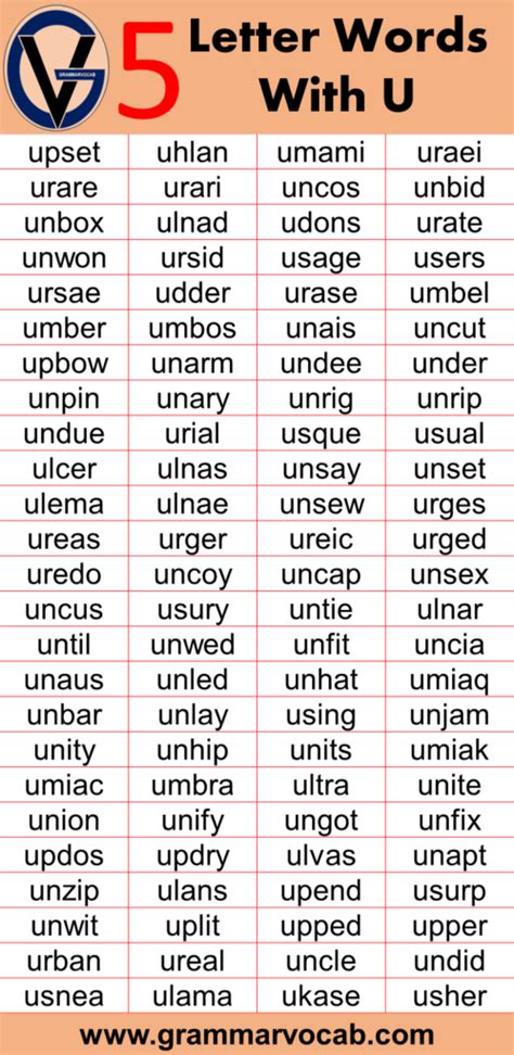 If you're looking to expand your vocabulary and learn more five letter U words, there are a few resources you can use. You can start by taking a look at a dictionary and looking for words that start with U. You can also take a look at online word databases and look up five letter U words. Finally, you can find great word lists and games online that will help you learn five letter U words in no time.